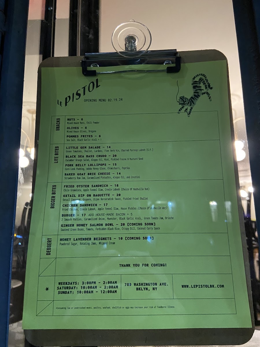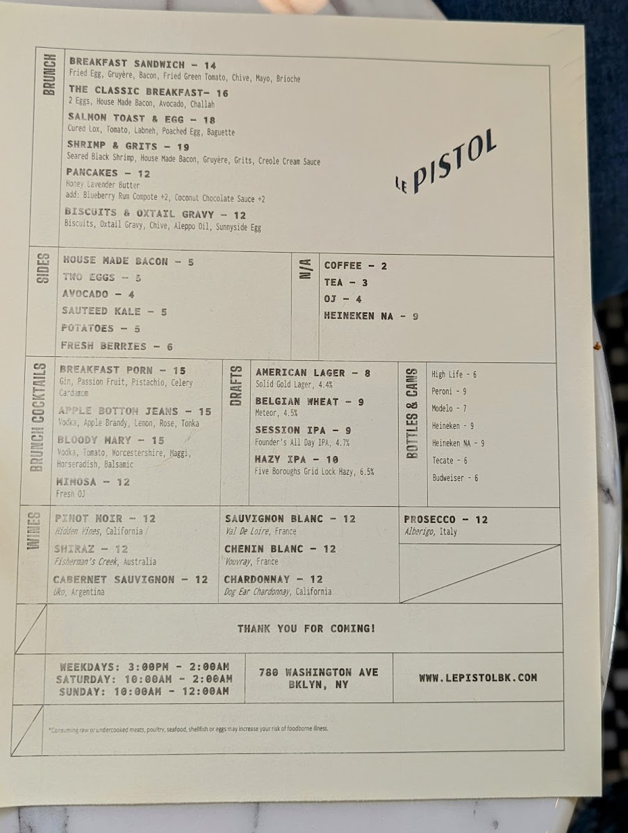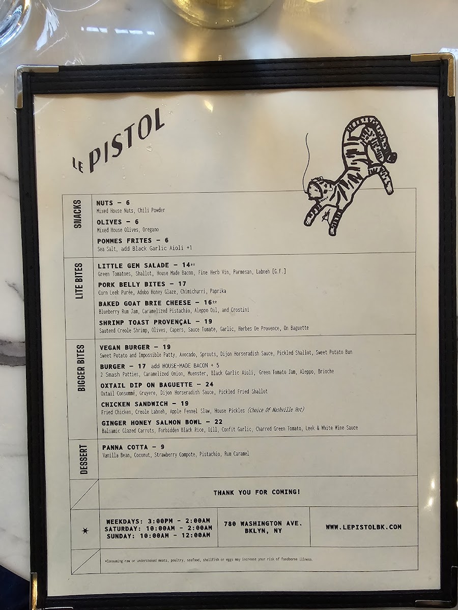 Welcome to Le Pistol Bar & Cafe, a charming spot located in the heart of Prospect Heights, Brooklyn. This lively venue offers a diverse menu that beckons food lovers and ambiance seekers alike. The highlight is undoubtedly the signature dishes, such as the delectable smash burger and the indulgent Oxtail French Dip, sure to delight any palate.